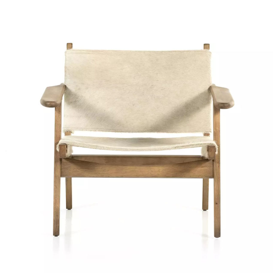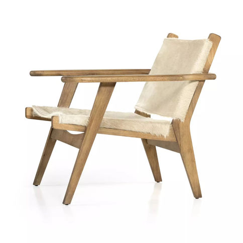 Vintage vibes, modernized. Sling seating shaped from a light buff hide is framed by solid oak for a clean, monochromatic look. A variance in coloring and pattern is to be expected, and speaks to hides’ one-of-a-kind nature.